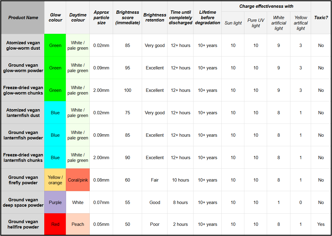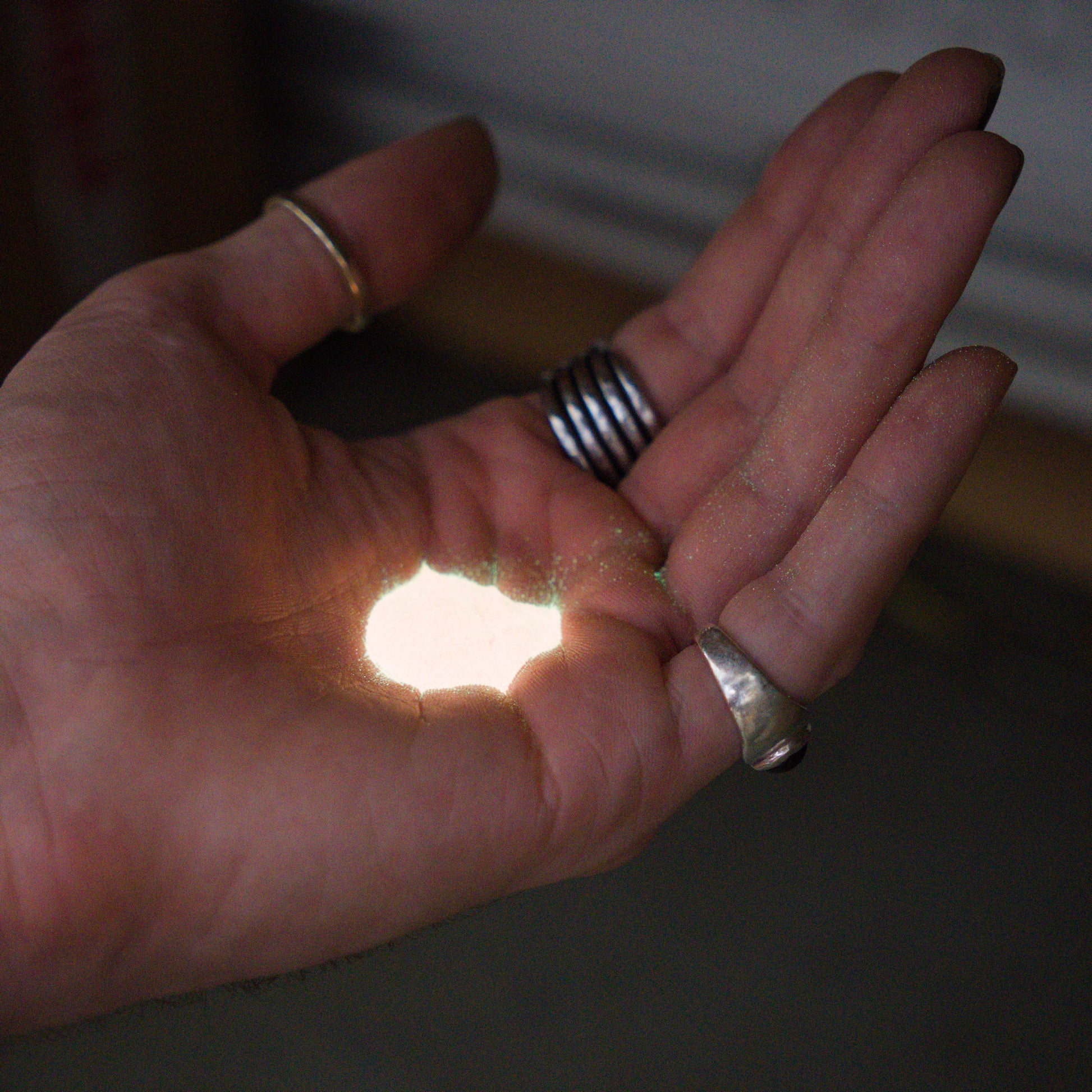Infinitely re-chargeable with no degradation. Charge it with the sun, most torches/flashlights, UV light, or even your phone torch. Easily mixes into all paints, polishes, gels, resins, glues etc.