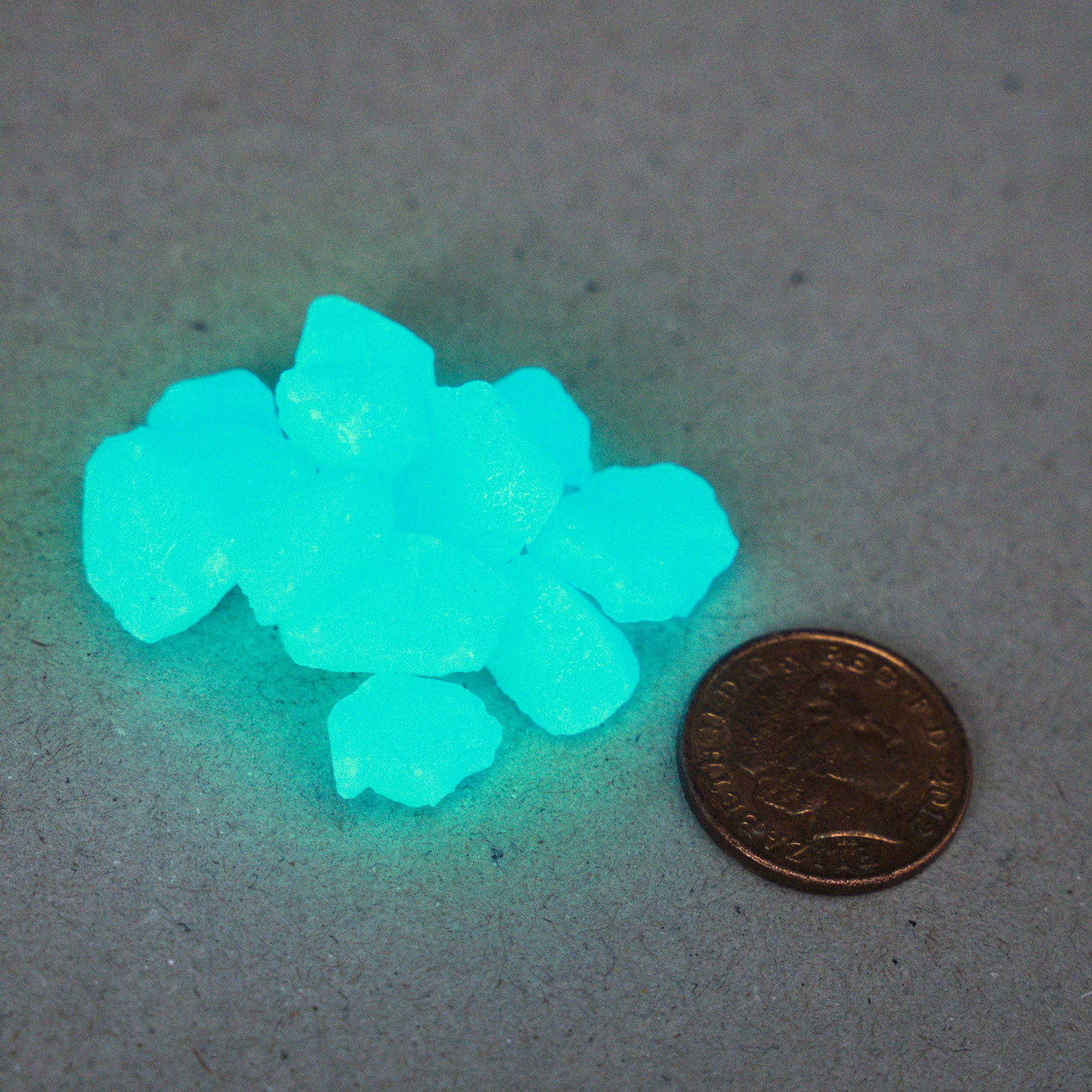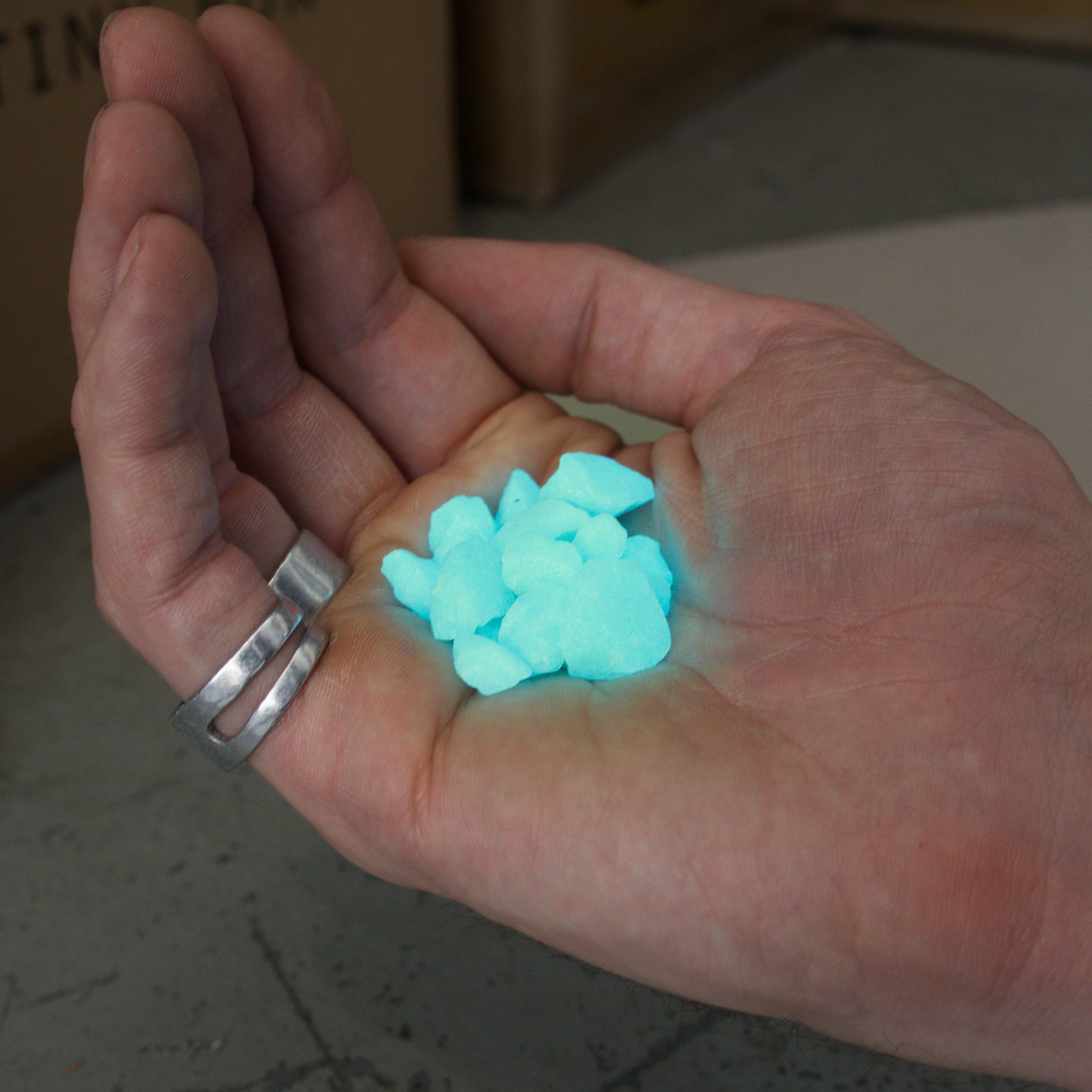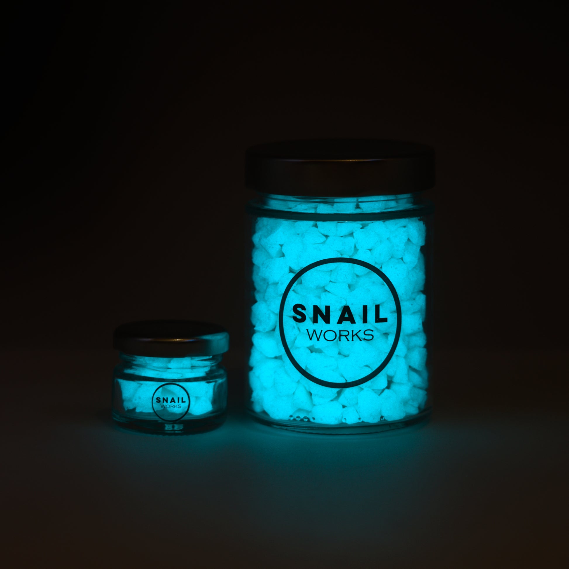 We take our brightest ever 'vegan lanternfish' glow-in-the-dark material, and sinter it with heat and pressure in a mixture of silica (the same substance that makes up most rocks, as well as over 90% of the earth's crust). This produces actual glow-in-the-dark stones. We then waterproof them so they can be used outdoors and underwater.